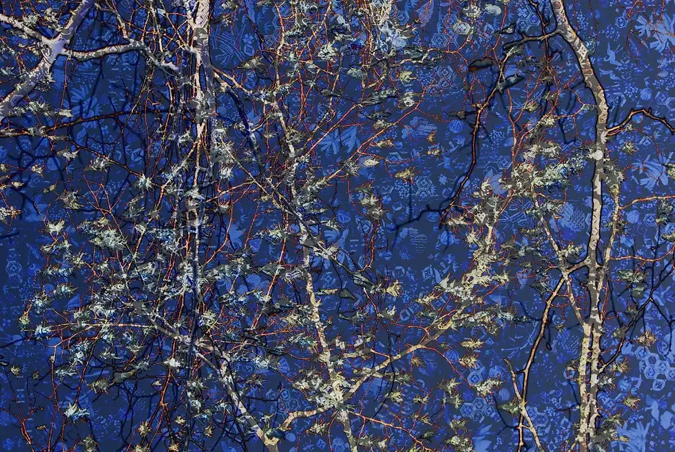 Le fond est un tissu, un motif de kimono répété, patient, presque hypnotique. Par-dessus, les branches se déploient et se croisent, dans une écriture toute végétale.